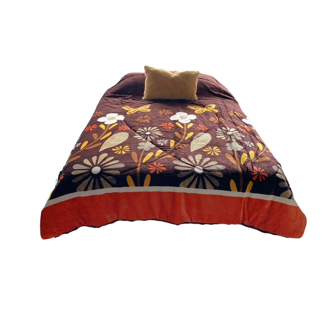 Abrígate con la máxima suavidad y calidez que solo un edrecobertor de borrega puede darte. Su diseño en tono café combina fácilmente con cualquier decoración, brindando un estilo elegante y acogedor a tu habitación.